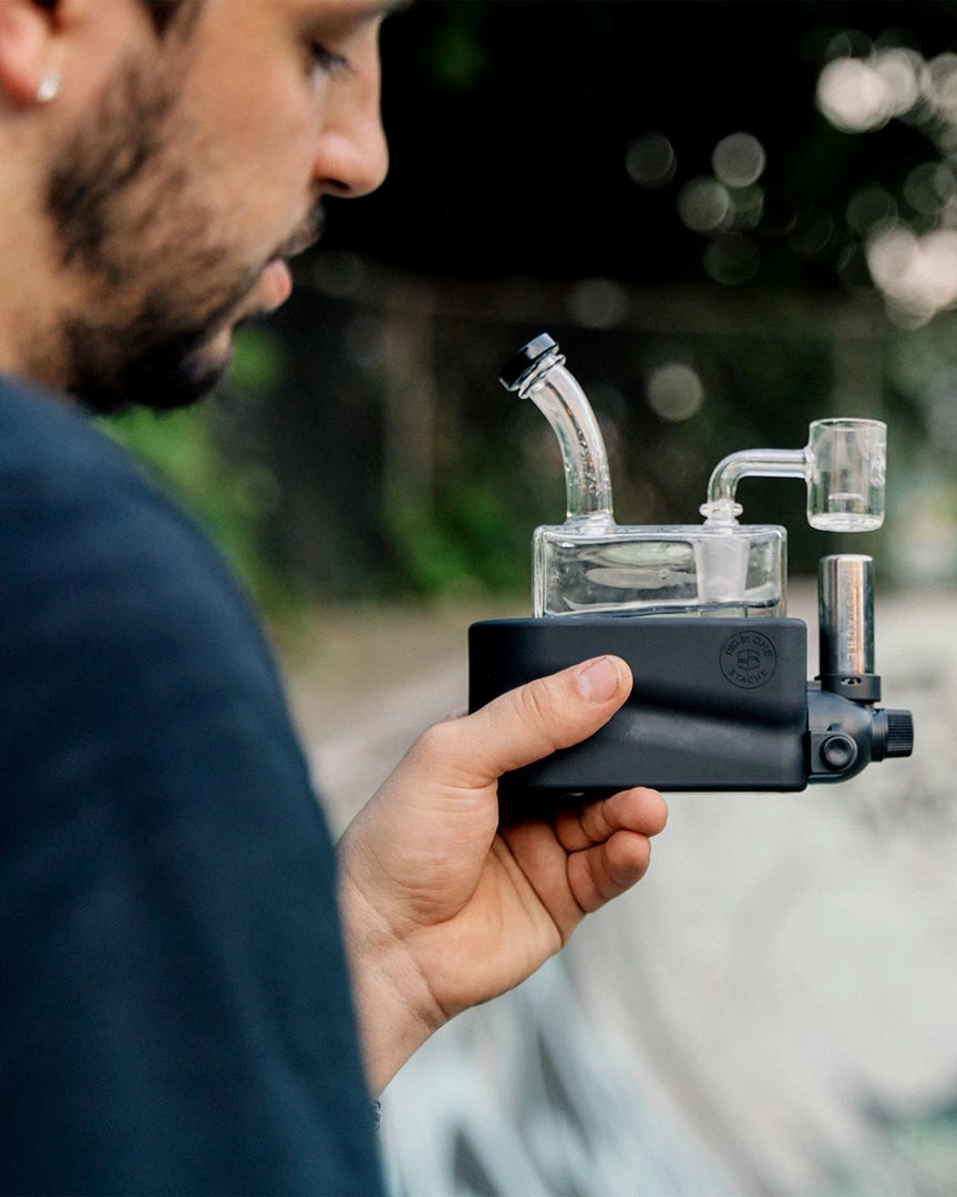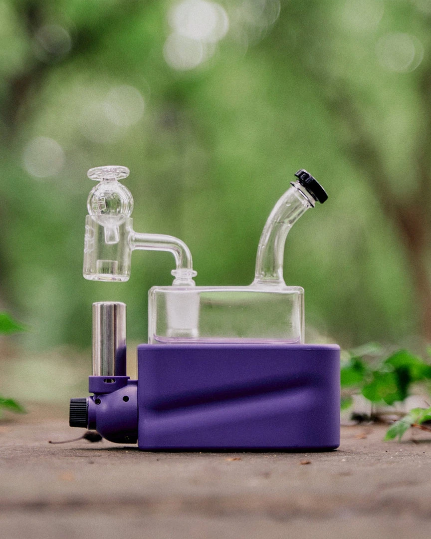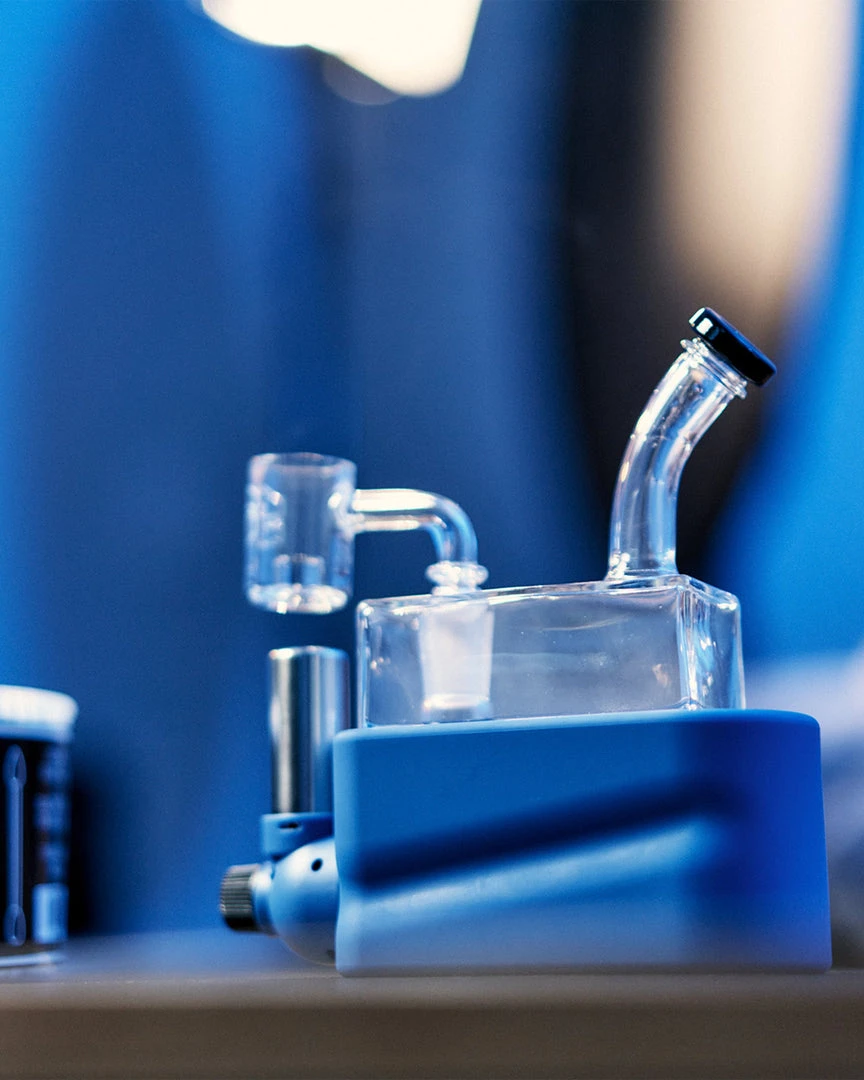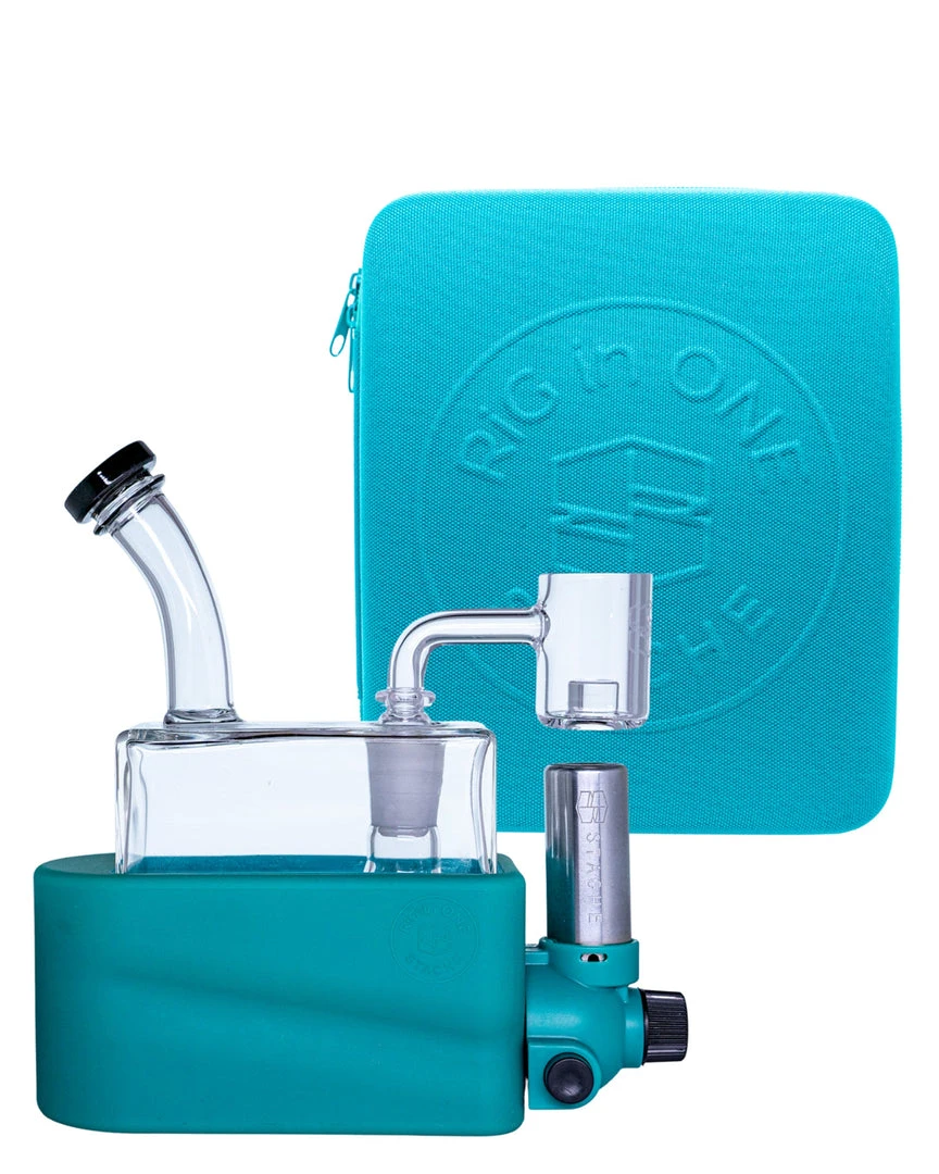 Made from uniquely crafted 4mm thick borosilicate glass, the Rio Rig features a flared mouthpiece, cube design, wide showerhead perc beneath a recessed 14mm female joint for less likelihood of breakage. The bubbler rests in Rio’s hard colorful base, which also houses a specially designed refillable, adjustable butane torch, heating a Core Reactor 14mm male quartz banger nail positioned above the torches nozzle. The Rio Matte Kit also includes a puddle pusher carb cap to ensure you get the most out of your concentrates.