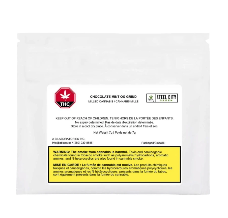 Chocolate Mint OG Grind by Steel City Green is an Indica dominant hybrid strain with a very strong THC and terpene potency potential. Genetics of this strain come from crossing Emerald OG and Grandaddy Purple. This strain features whole flower milled to perfection for easy rolling, packing, baking or vaping, and offers sweet, tangy aromas reminiscent of citrus and mint, complemented by a lingering mint flavor when burnt. Prominent terpenes in Chocolate Mint OG are Myrcene, Pinene, and Guaiol. This strain is harvested from our indoor, state of the art climate-controlled cultivation rooms ensuring consistent quality and freshness. Our pre-shredded (pre-ground) cannabis is packaged fresh, includes a Nitrogen infusion as well as a humidity pack, and never requires or undergoes irradiation or other microbial elimination processes.