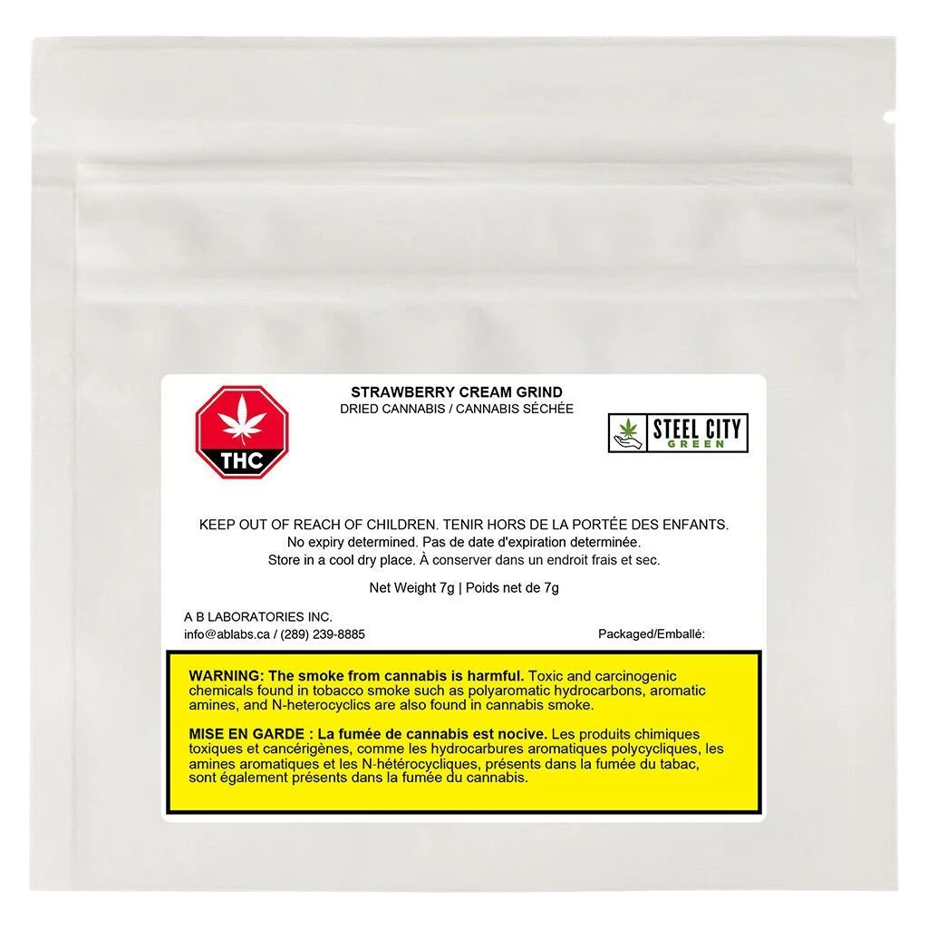 Strawberry Cream Grind by Steel City Green is a sativa dominant hybrid with a very strong THC potency potential. This terpene-rich strain was bred by crossing Strawberry Crème and Ice Cream. Strawberry Cream Grind features whole flower milled to perfection for easy rolling, packing, baking or vaping, and offers a sweet, sour, and fruity aroma. Covered in glistening crystals from top-to-bottom, these buds are drenched in trichomes. Prominent terpenes are myrcene, pinene and limonene. This strain is harvested from our indoor, state of the art climate-controlled cultivation rooms ensuring consistent quality and freshness. Our pre-shredded (pre-ground) cannabis is packaged fresh, includes a Nitrogen infusion as well as a humidity pack, and never requires or undergoes irradiation or other microbial elimination processes.
