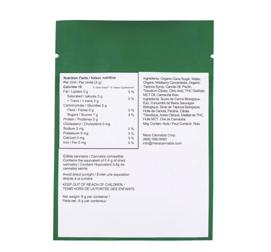 Wild Berry Fruit Juices, no added colours or flavours. Contains 10 mg of THC, no cannabis taste.