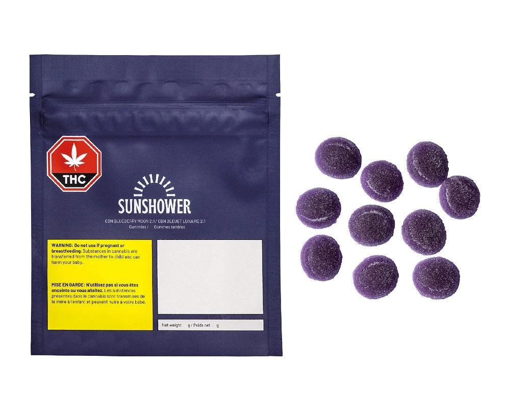 Sunshower CBN Blueberry Moon is bursting with the taste of fresh blueberries, 2mg CBN and a 1mg microdose of THC so you can slide into the moonrise with no cannabis aftertaste. There are 10 microdose gummies in every pack making it easy to find the right dose for your perfect night.