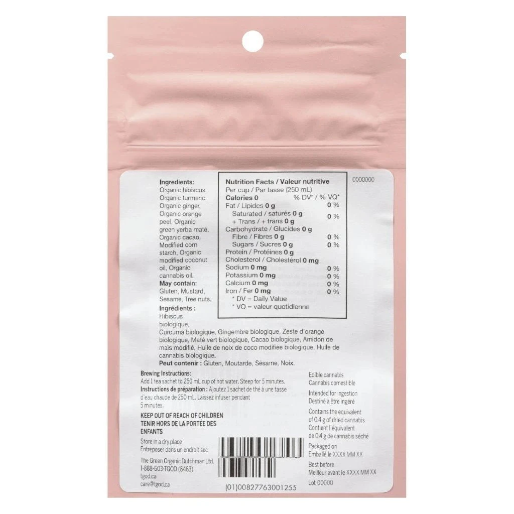 TGOD Organics Happy Hibiscus Mate THC Whole Leaf Tea combines the highest quality organic ingredients with 5 mg THC from certified organic cannabis. Featuring energizing yerba mate, tart hibiscus, sweet cacao & orange peel, bright turmeric with a warm ginger finish. Responsibly sourced premium ingredients are packed in a resealable pouch containing 2 biodegradable pyramid sachets. Add 1 tea sachet to 250 ml cup of hot water and steep for 5 minutes. Absorption can occur in just 15 minutes with 4.5X more absorption versus oil alone. Sip and enjoy!