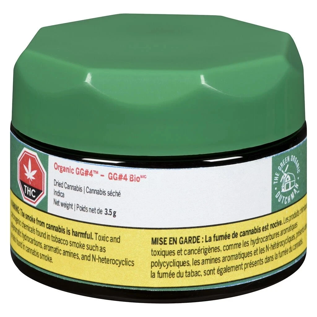 The Green Organic Dutchman presents Organic GG #4. Certified organically grown in living soil, this Indica-dominant flower offers a classic flavour and aroma profile, leaning heavily into traditional cannabis notes of sourness, earthiness, and hints of a light floral sweetness.