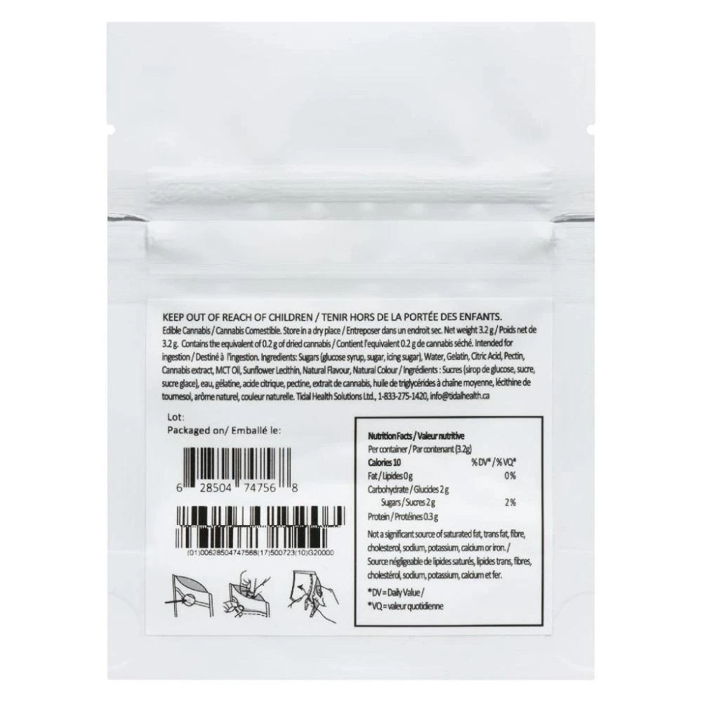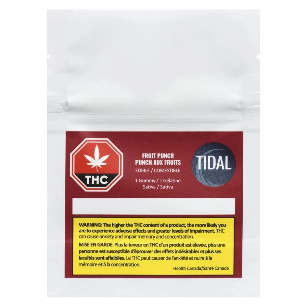 Tidals 1-pack of Fruit Punch Chews contains a total of 10 mg of THC. Each soft chew contains 10 mg of THC. Tidal Soft Chews are made with full-spectrum extract which provides not only the tetrahydrocannabinol (THC) but also various other minor cannabinoids, terpenes, flavonoids and other substances present in the cannabis plant. These plant compounds are responsible for the cannabis taste and flavour of the extract. Be patient: it can take 30 minutes to 2 hours before you will feel the effects of ingesting THC. Go slow: wait at least 4 hours, even up to 24 hours to see how you feel before consuming any more.