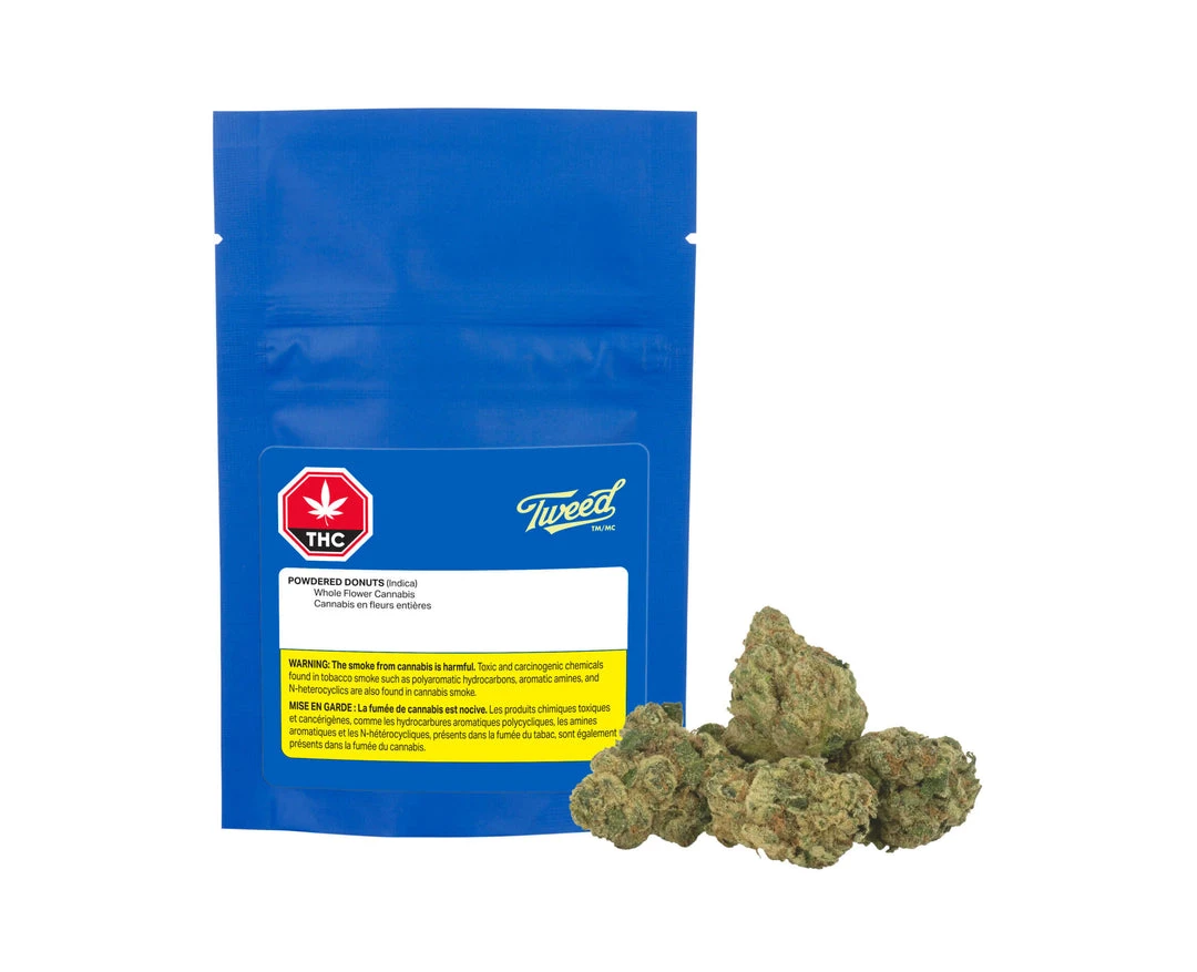 Tweed Powdered Donuts is an indica strain with high THC and minimal amounts of CBD. Powdered Donuts comes from a cross of Jet Fuel Gelato and Orange Cookies. Its buds are tight, with orange hues and dense trichome coverage. Some associate citrus, floral and fruit flavours with the Tweed Powdered Donuts Strain.