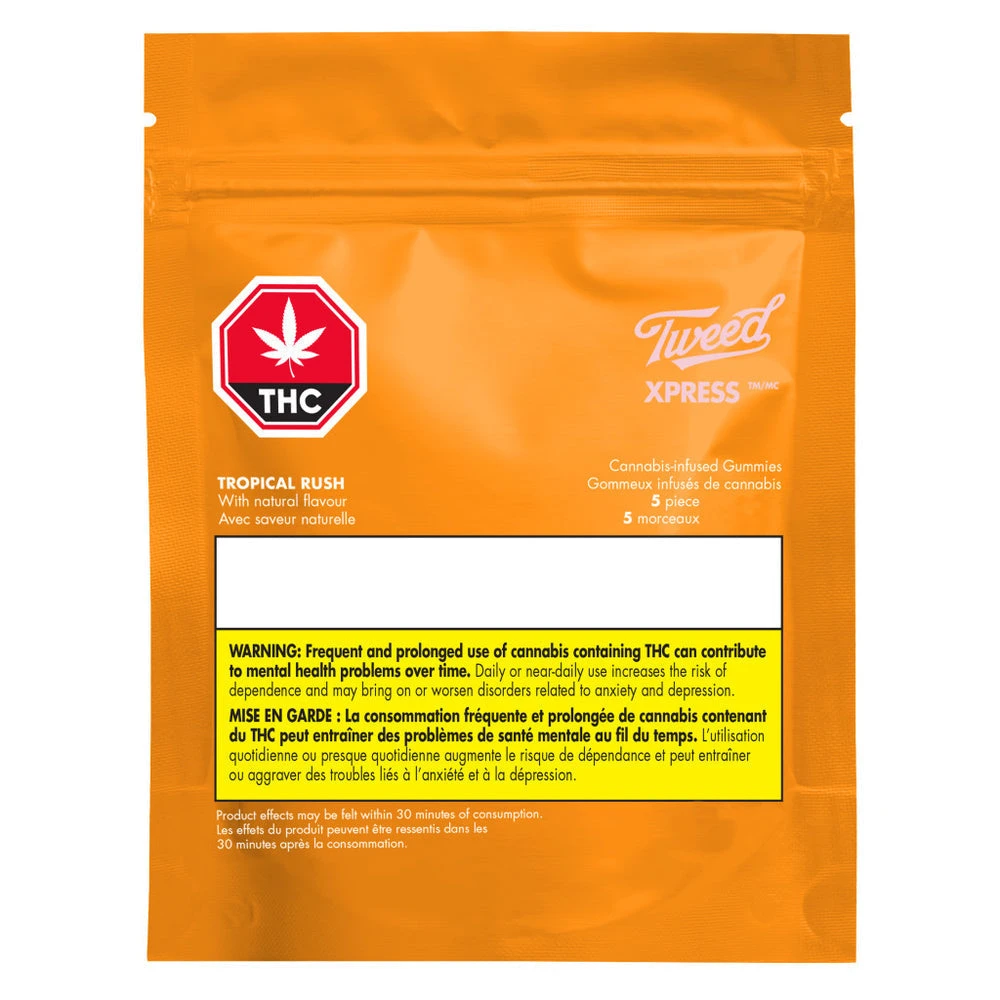 THC: 10.0 mg CBD: < 0.00 – 100.0 mg — Release a blast of tropical fruit flavours with Tweed XPRESS Tropical Rush, the soft chew edible that’s gushing with natural flavour and fruit juiciness. Effects may be felt within 30 minutes of consumption (like all products containing THC, individual results may vary).