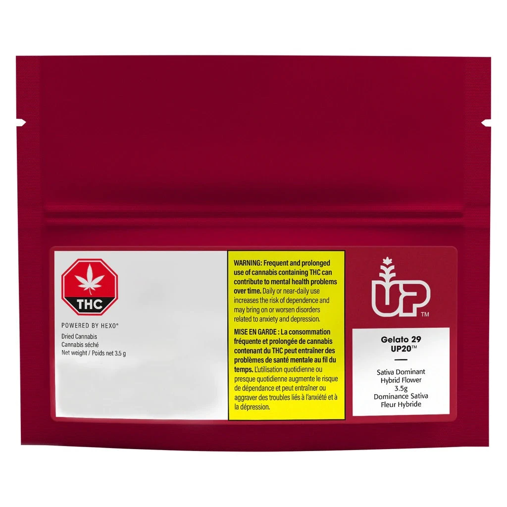 Gelato 29 is a distinct sativa-dominant hybrid that maintains traits that make Gelato hybrids highly popular β fluffy buds with touches of purple, orange pistils and super sweet terpene profile. Gelato 29 sets itself apart with lighter green buds and shiny white trichomes all over. Not just pretty to look at, Gelato 29βs aroma is a mouth-watering crowd-pleaser β bold fruity and berry with slight undertones of vanilla and cream. Gelato 29 UP20β’ flower is indoor-grown in our Atholville, New Brunswick facility and promises to deliver 20% THC or higher. Every time.