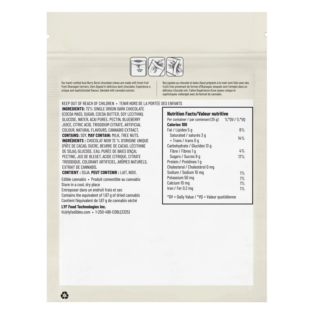 Acai Berry Burst chocolate chews are made with fresh fruit from Okanagan farmers, then dipped in delicious dark chocolate. Approximately 2mg of THC per piece, and five chews per pack.