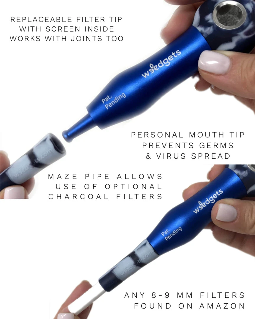 The pipes silicone mouthpiece is fitted with a metal screen and can be used separately as a filtration attachment for other small pipes, vape pens, and roll-ups. The detachable mouthpiece acts as a personal, protective mouthpiece and offers a safe way to smoke together from one device while reducing the spread of germs and viruses. The Maze pipes removable metal herb bowl comes with a perforated lid that enables you to load and cap your bowl for safe transport without worry of spills. The pipe is compatible with charcoal filters and is easy to clean and maintain with isopropyl alcohol or grease, removing soap and water.