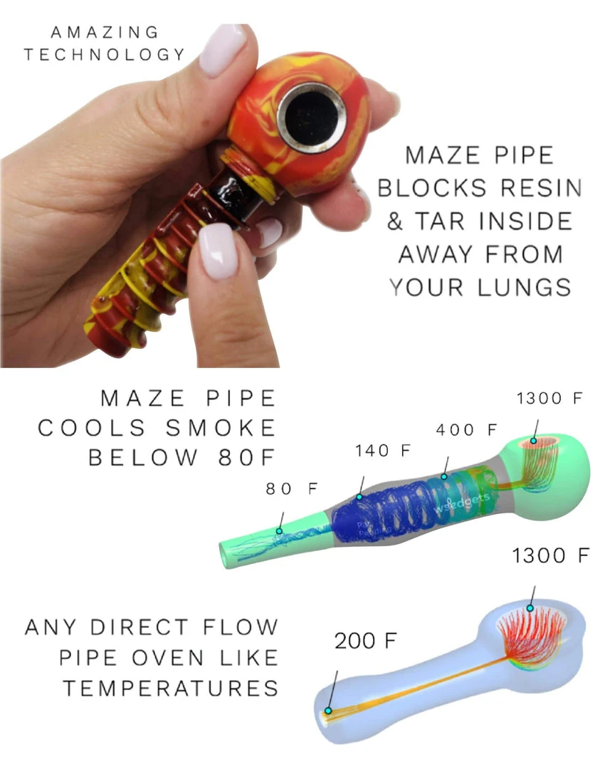 The ingenious Maze Pipe comes in a box with two extra bowls and is available to order in a selection of colors. Please select the color of choice from the available options in the drop-down menu when placing your order. This durable and heat-resistant hand pipe is great for both beginners and seasoned smokers and is decorated with Weedgets decal. Add some color to your collection and impress your friends with this almost indestructible Maze Pipe by Weedgets.