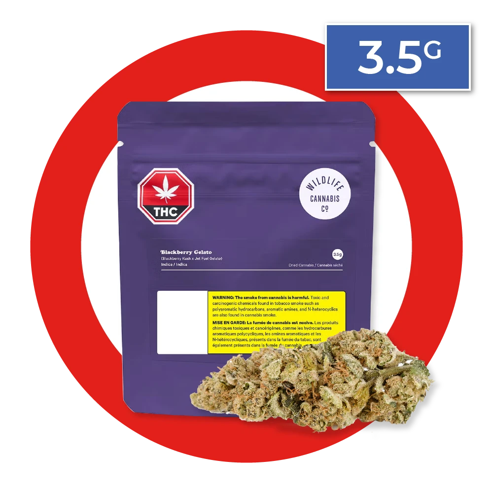 Our Blackberry Gelato pre-roll smells like a freshly-iced blackberry strudel – fruit-forward, with undertones of fuel, Canadian maple, and mulled spices. A crowd favorite with a caryophyllene-dominant terpene profile to add a hint of black pepper and spice. Limonene, farnesene, and linalool exaggerate the light-but-fruity overall flavour, rounded out with myrcene. The ripe flowers are round, very dense, and sticky – especially once cured. Visually, they’re a West Coast Rainforest-green, with hints of dark purple throughout, contributing to the cultivar’s name. This in-house bred cultivar is the result of a cross between a Jordan Of The Islands Blackberry Kush & Jet Fuel Gelato, and an ensuing pheno-hunt to curate the ideal flower for the pre-roll market.