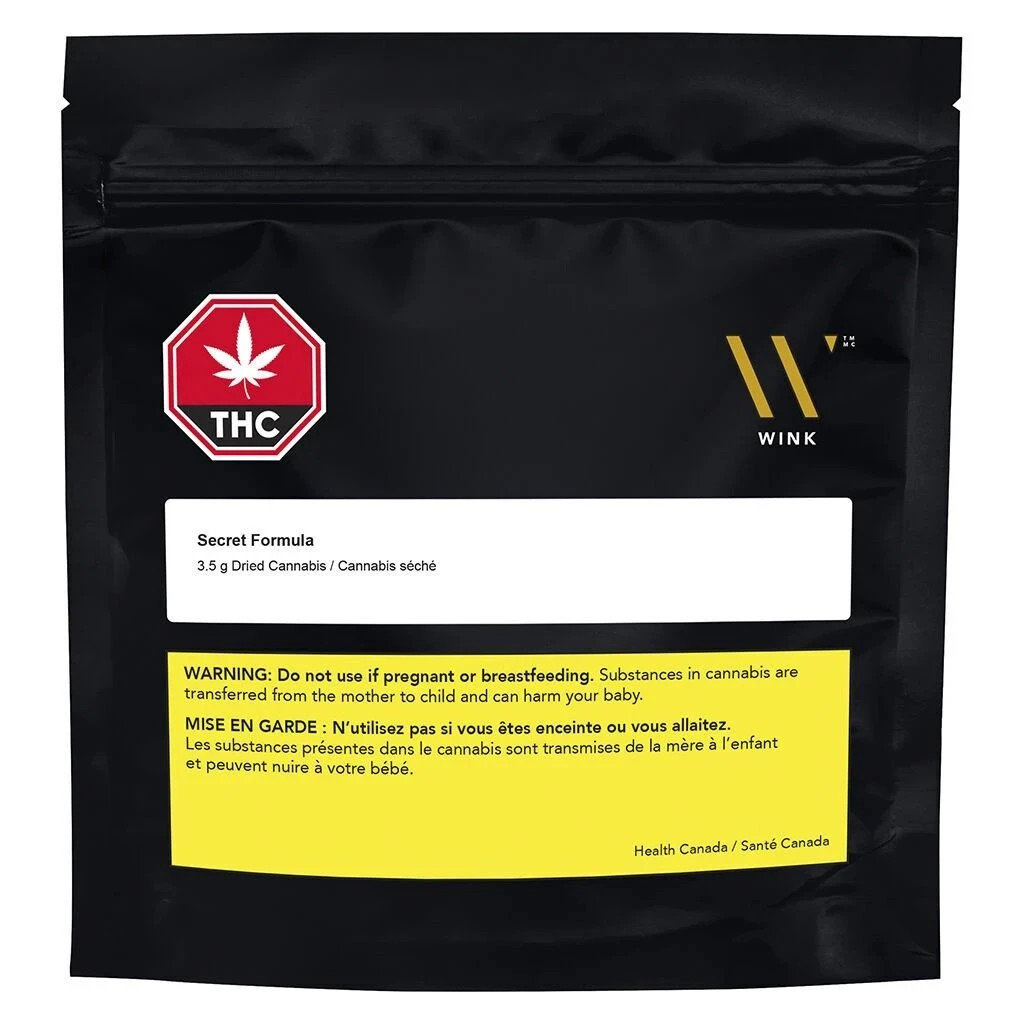 WINK SECRET FORMULA is a THC potent, indica-dominant hybrid flower that’s a cross between popular strains Do-Si-Do and White Fire #43. Boasting a high 3.52% terpene content, the flower is indoor grown, hand-groomed, and sustainably grown in a purpose-built facility in Alberta. This strain was bred to combine the Kush characteristics of White Fire #43 with the sweet and earthy flavours of Do-Si-Do, creating a beautifully dense, ultra sticky, trichome-rich bud. Dominant terpenes include limonene, myrcene, and caryophyllene, so you can expect a delicious sour citrus and diesel aroma. WINK SECRET FORMULA is available in a 3.5g dried flower. 10% of the profits from all WINK products are donated back to homelessness and social services.
