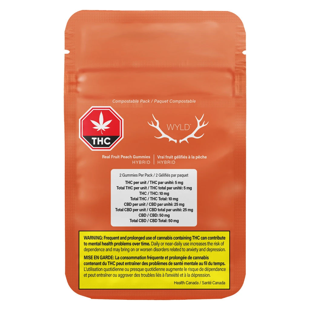 Wyld Peach Hybrid + CBD soft chews are sustainably made using real fruit, botanical terpenes and natural flavours. Our recipes are formulated by food scientists to provide consistent experiences that taste amazing. Wyld soft cvhews use sunflower lecithin to improve bioavailability and onset time, and are made to be thermostable up to 60 degrees Celsius, with a firm texture that doesn’t stick to your teeth. Each Wyld Peach Hybrid + CBD soft chew contains 5mg of THC and 25mg of CBD, combined with the terpenes limonene, linalool, alpha-pinene, and beta-pinene. Wyld uses compostable packaging and carbon-neutral manufacturing to support a healthy planet. Two pieces per pack.
